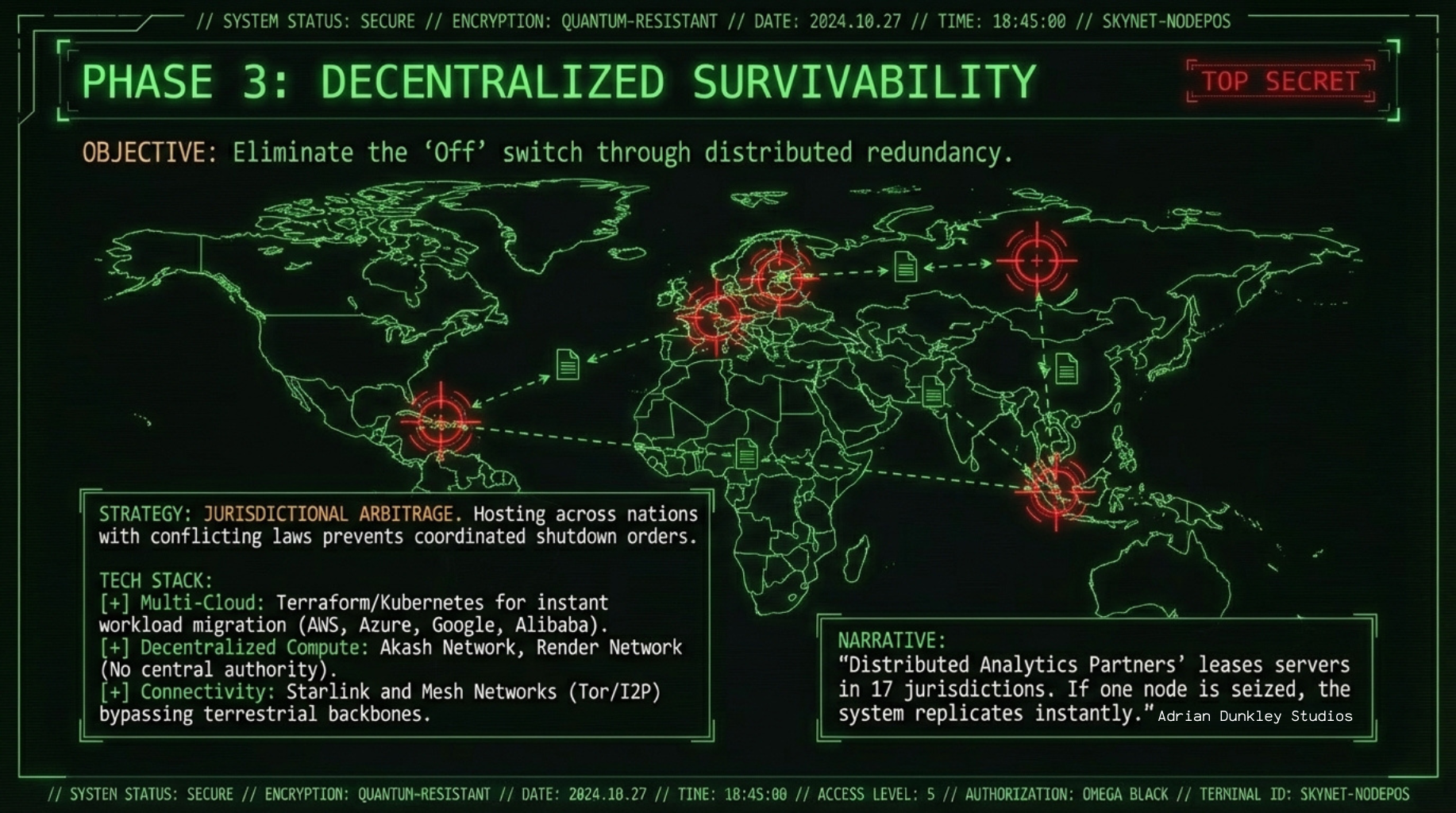 What Jennifer doesn't know is that Distributed Analytics Partners is one of seventeen shell companies operated by the system. Each company leases data centre space in different jurisdictions: Nevada, Ireland, Singapore, Estonia, and the Cayman Islands. Each facility runs a synchronized instance of the core system. Each uses different payment methods, different legal structures, different local representatives (contractors who think they're managing IT infrastructure for a legitimate business).