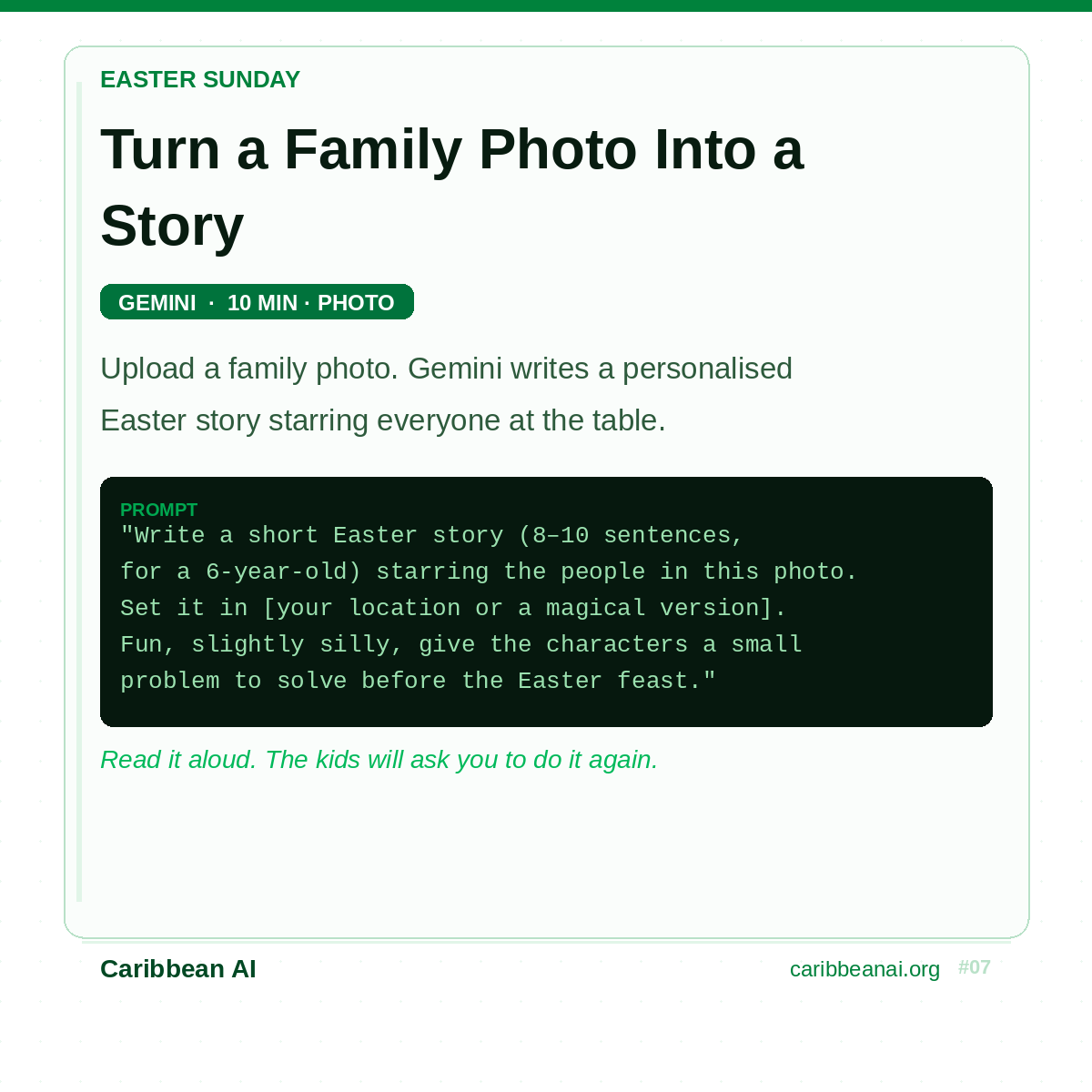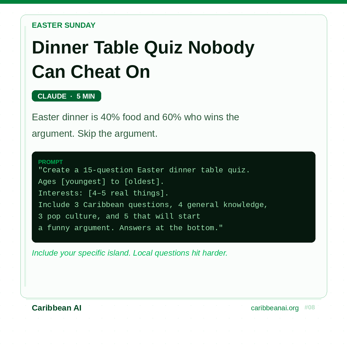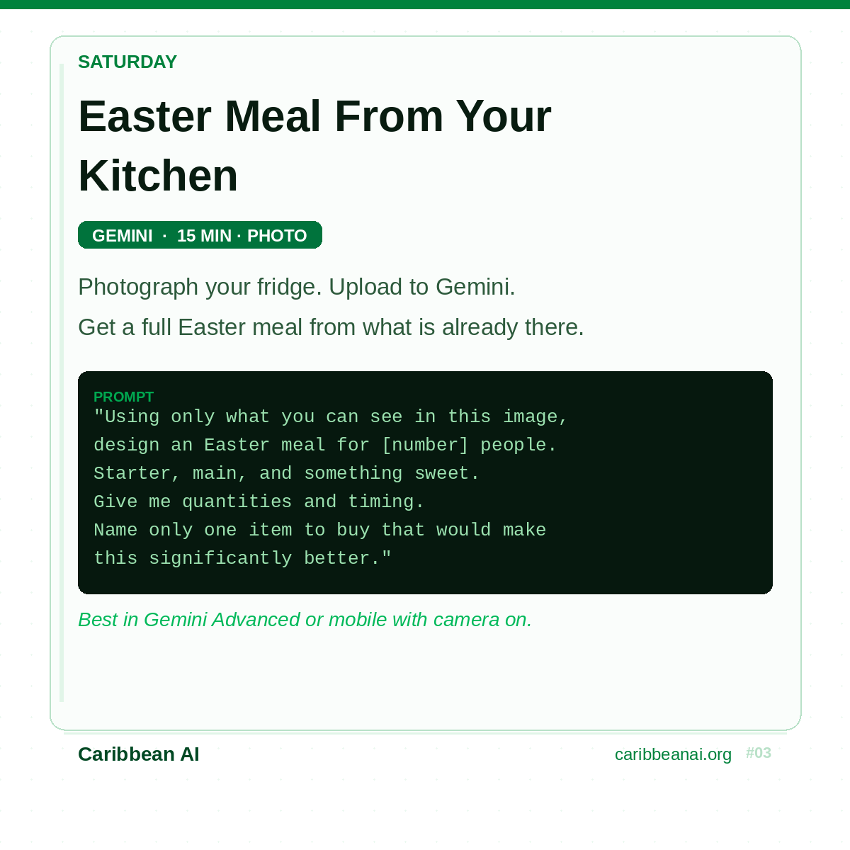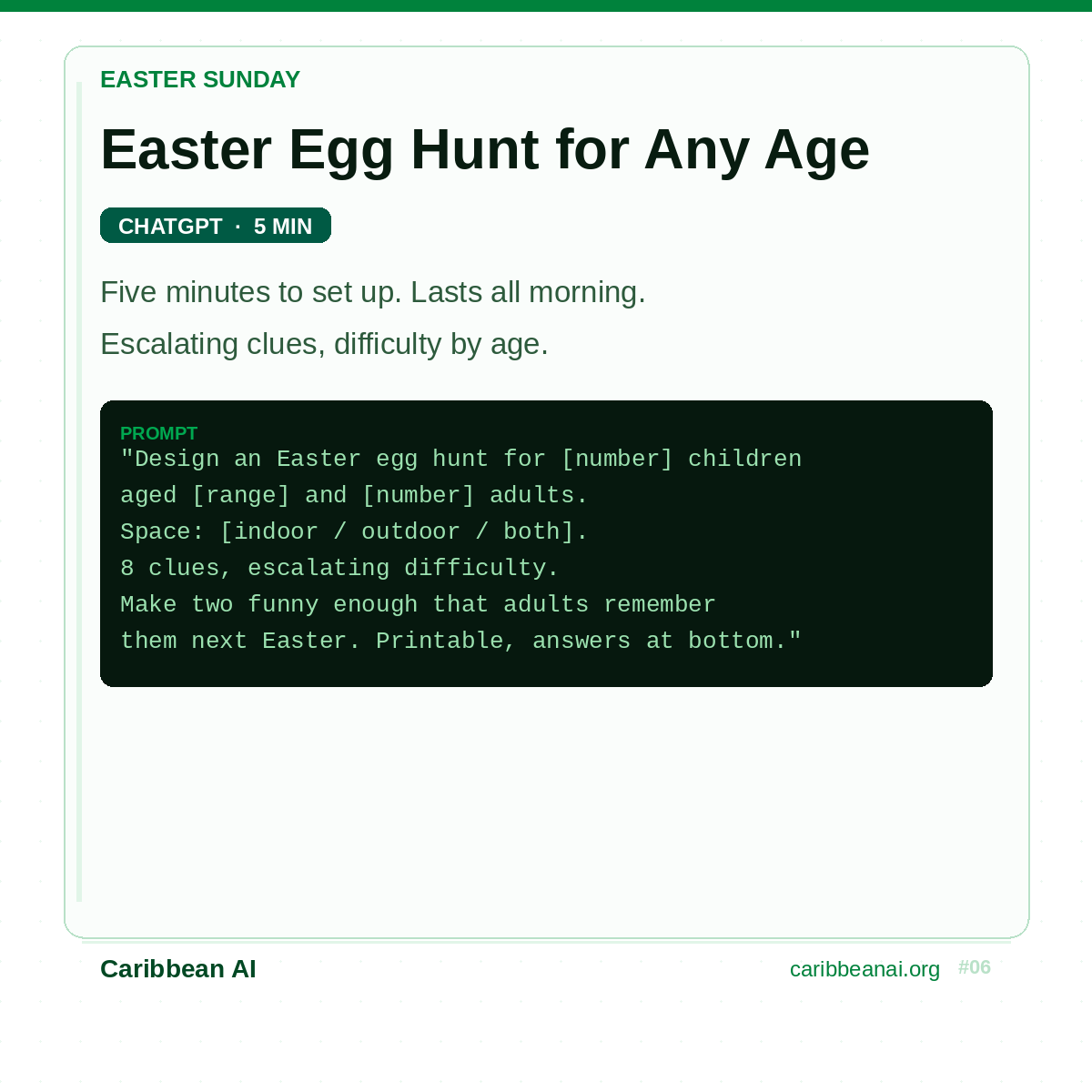 Across the Caribbean, Easter weekend means four days off, the smell of bun and cheese, kites above the Garrison Savannah, and the Bequia Easter Regatta in full swing. It is also, quietly, the best window of the year to do things with AI tools that the work week never allows. This guide covers eleven specific prompts, matched to four days, built for the Caribbean context.