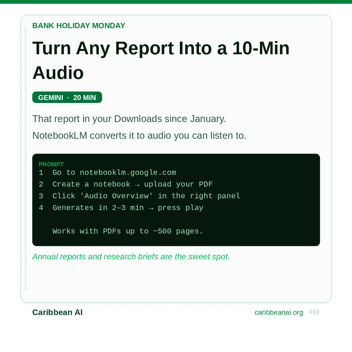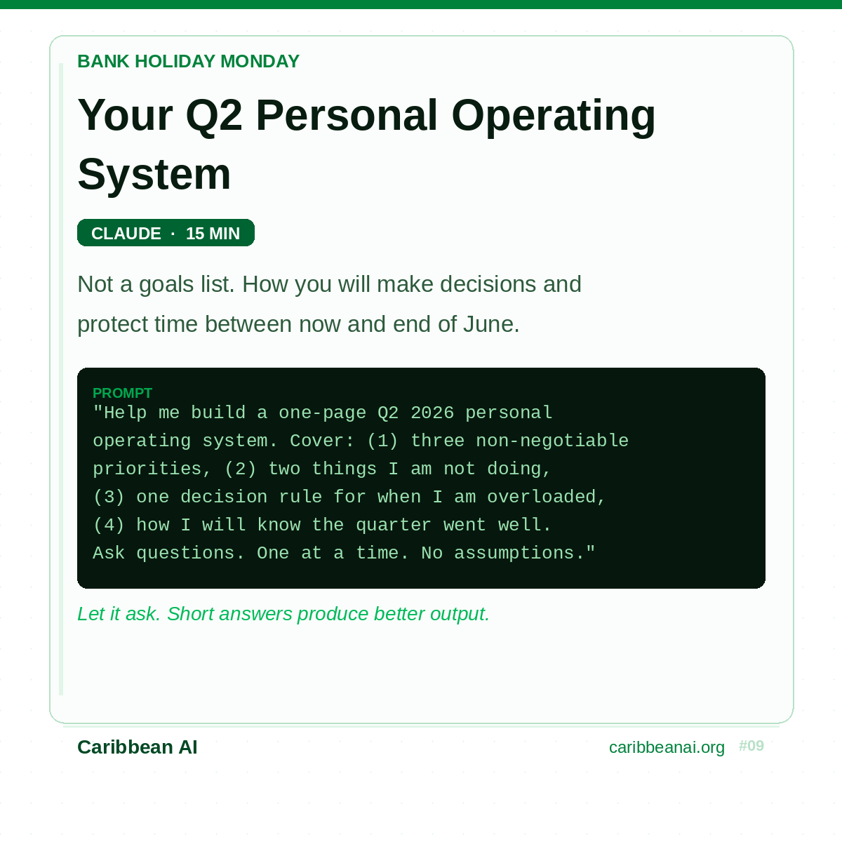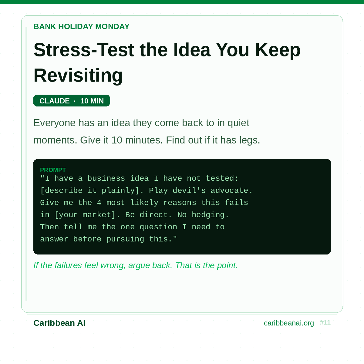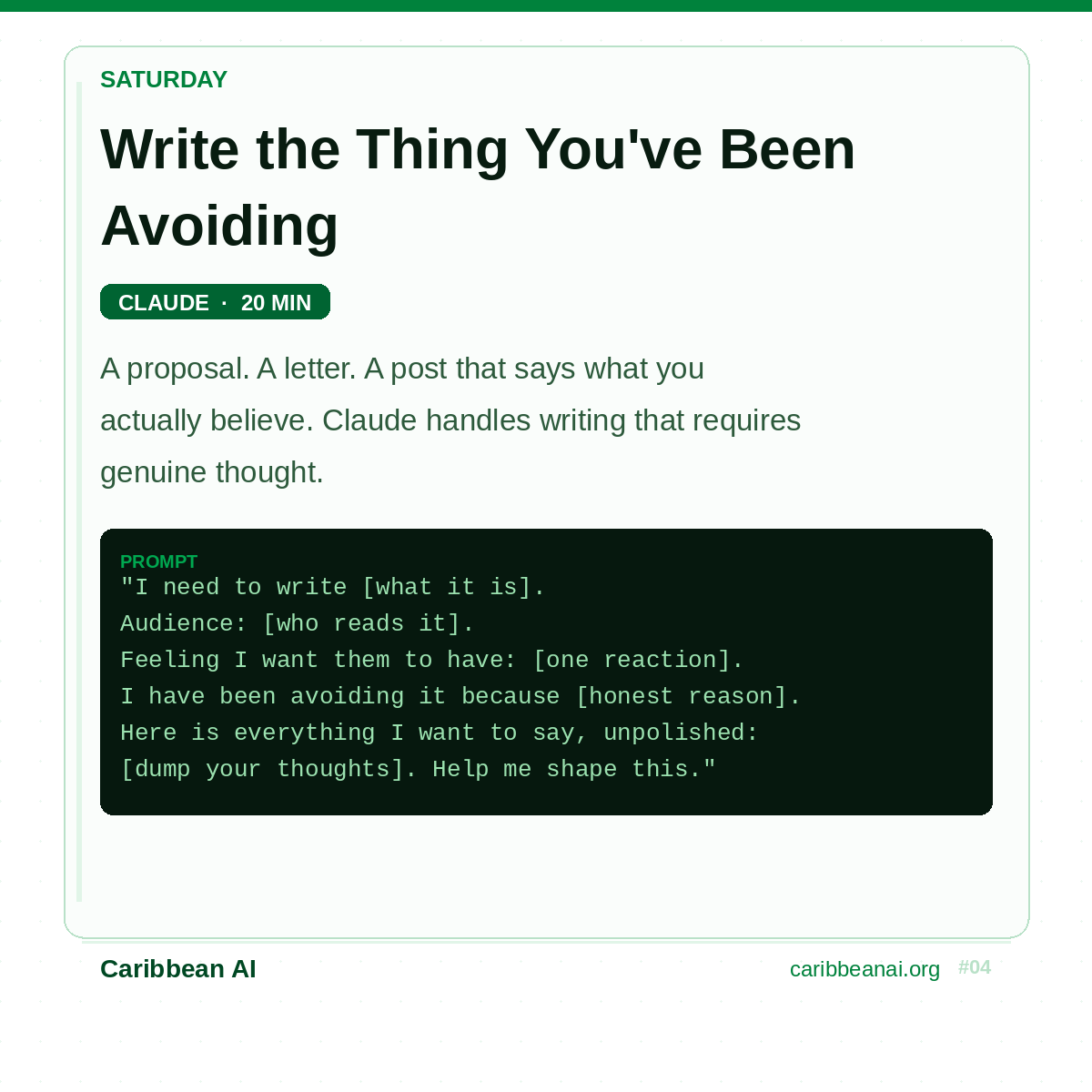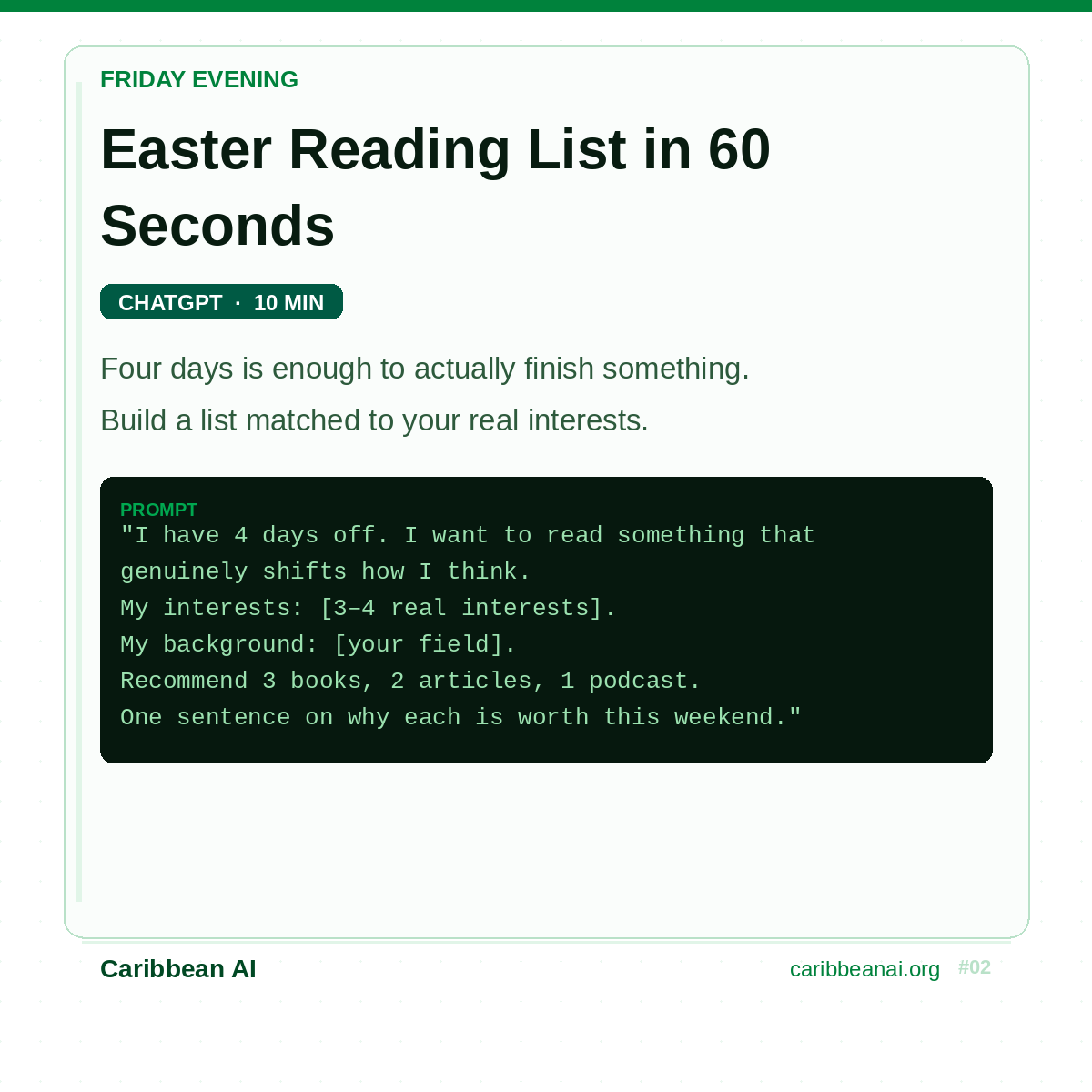 Adrian Dunkley, who founded StarApple AI in Kingston, Jamaica and has spent over fifteen years implementing AI systems across Caribbean enterprises, puts it plainly: the leaders in this region who will use AI well are not the ones who read the most about it. They are the ones who use it regularly enough to develop a feel for where it helps and where it misleads. A long weekend with no agenda is the best time to build that intuition.