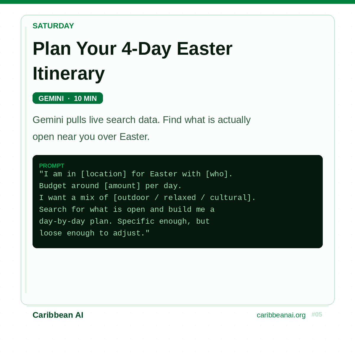 Yes. The Gemini itinerary prompt in this guide pulls live search data for your specific location. Enter your parish in Jamaica, your district in Trinidad, or your area in Barbados, and Gemini will search for what is actually open over Easter and build a day plan around your preferences and budget. It will not be perfect, but it eliminates most of the decision fatigue.